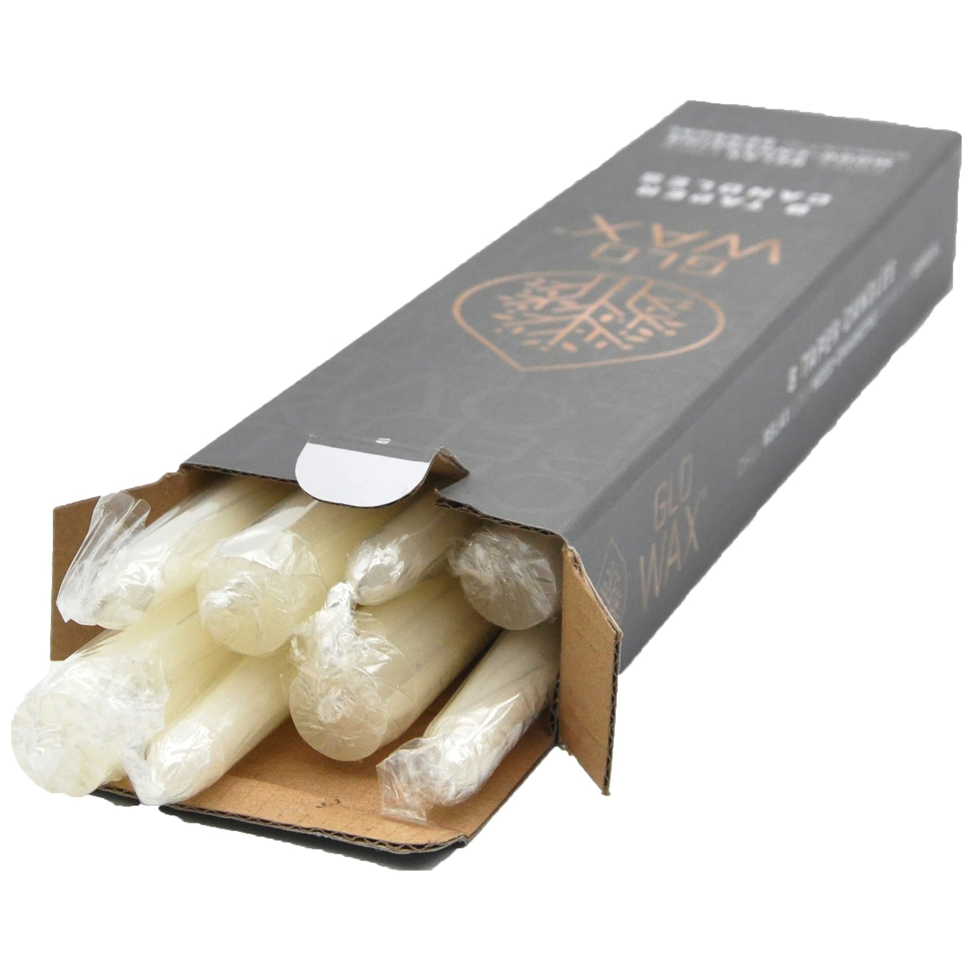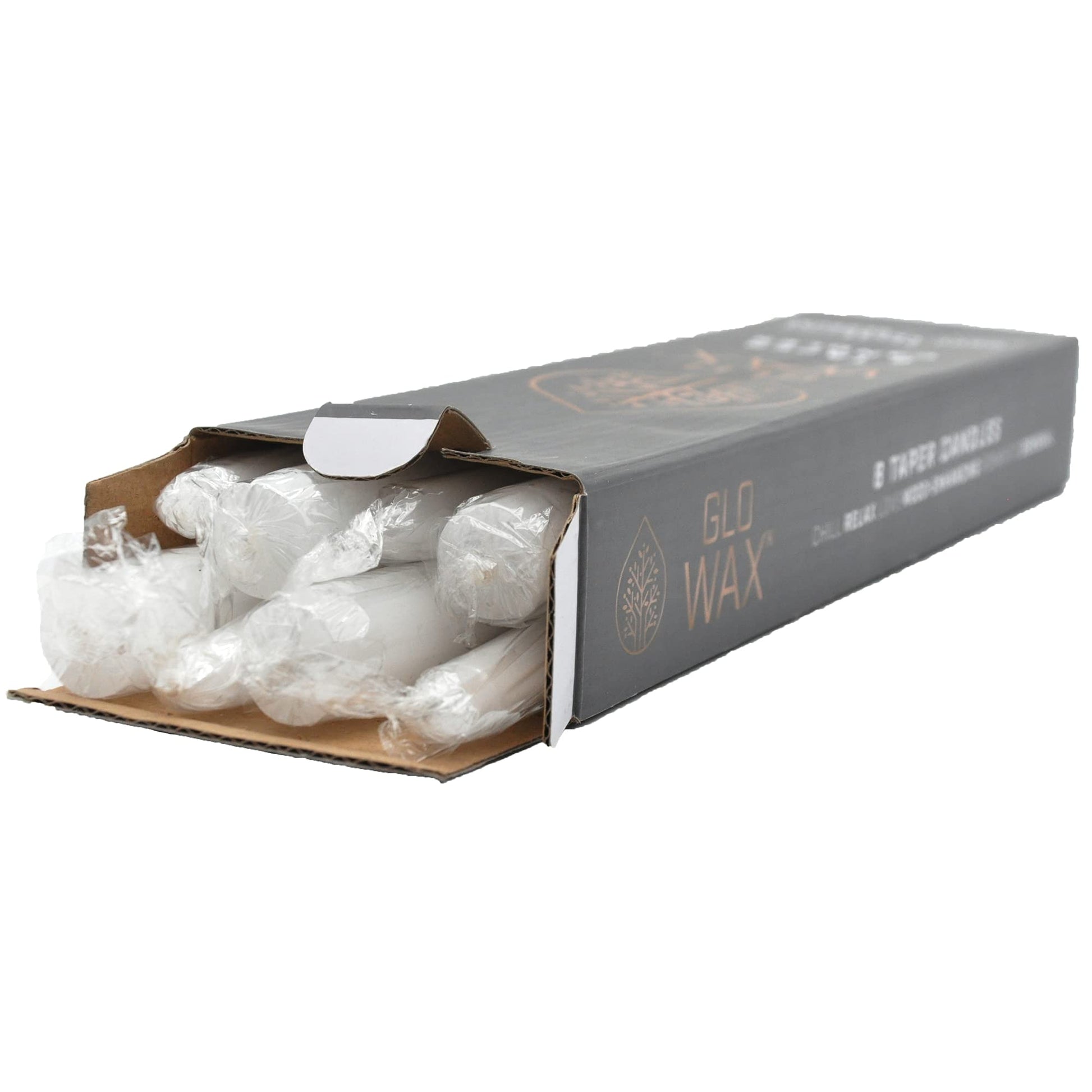 - Glo-Wax tapered candles, a classic ivory wax or a beautiful white. These simple, yet elegant candles give a steady flame - perfect for all occasions. Our high-quality tapered candles are available in a pack of 8, 16 or 32 and burn for up to 8 hours